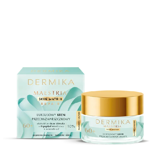 Dermika Zestaw Maestria to luksusowy zestaw kosmetyków przeznaczony do zaawansowanej pielęgnacji skóry dojrzałej 60+, złożony z dwóch kluczowych produktów: kremu przeciwzmarszczkowego do twarzy oraz serum przeciwzmarszczkowego. Produkty te zostały opracowane, aby odpowiadać na potrzeby skóry wymagającej regeneracji, ujędrnienia i głębokiego nawilżenia, z jednoczesnym działaniem przeciwzmarszczkowym.