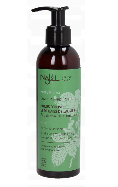 Odkryj prawdziwe mydło z Aleppo w płynie o właściwościach oczyszczających i tonizujących, będących zasługą dodanej wody z kwiatów róży damasceńskiej.