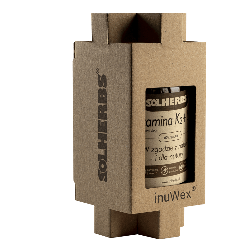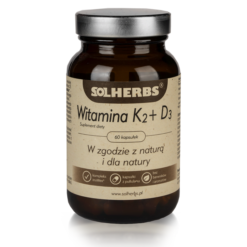 Suplement Solherbs uzupełnia dietę w stabilną formę witaminy K2 o wysokiej przyswajalności (MK7) oraz witaminę D3.