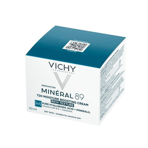 Vichy Mineral 89 to bogaty krem intensywnie nawilżający przeznaczony do codziennej pielęgnacji skóry twarzy kobiet w każdym wieku, której skóra narażona jest na działanie szkodliwych czynników. Unikalne połączenie składników aktywnych zapewnia długotrwałe nawilżenie oraz uelastycznienie skóry. Krem Vichy Mineral 89 Rich dzięki bogatej konsystencji ,odbudowuje barierę hydrolipidową naskórka, zapobiega nadmiernej utracie wody przez co skóra jest wygładzona i odpowiednio nawodniona. Krem został przebadany dermatologicznie.